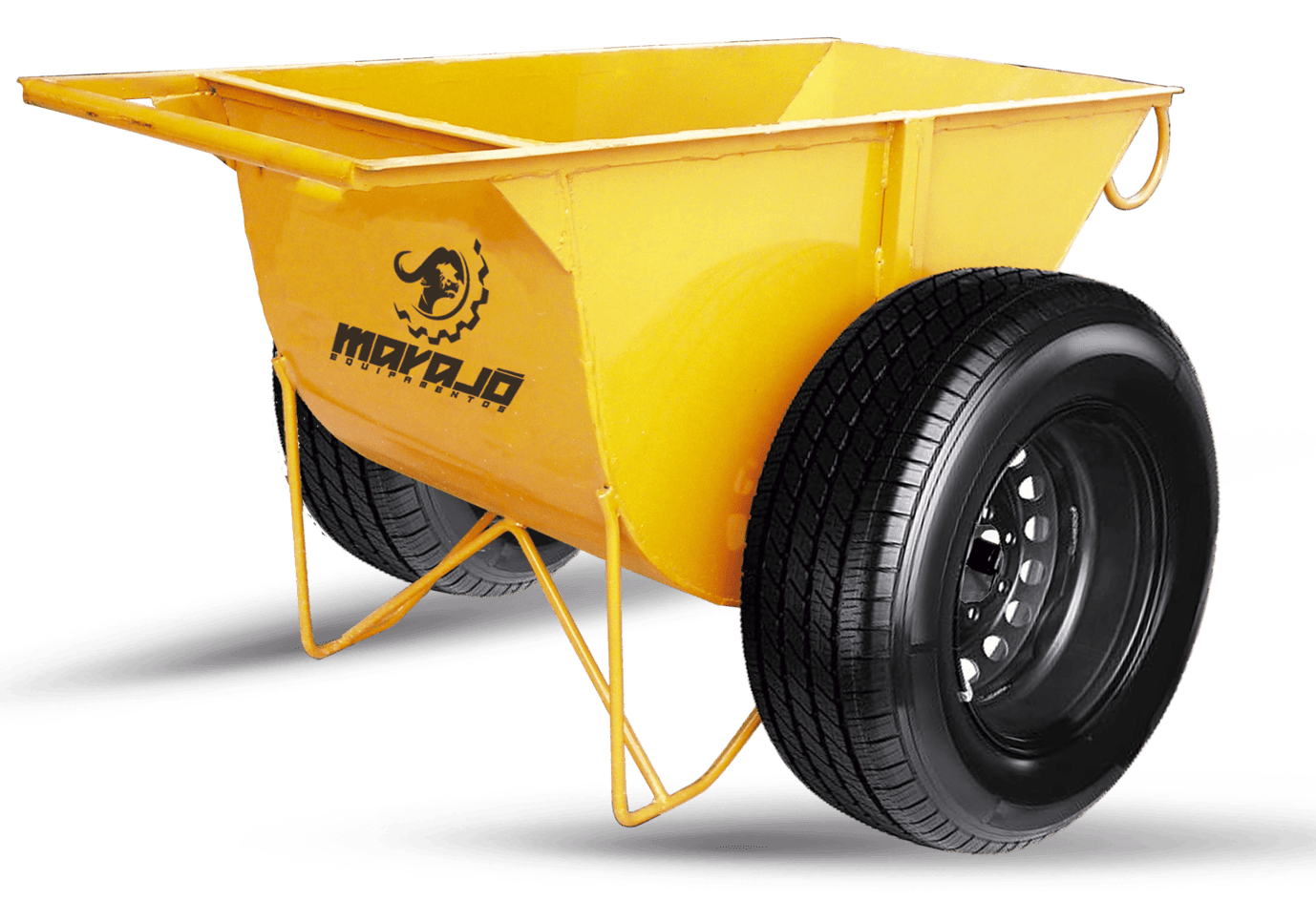 Carro de tração manual, Marajó, tipo meia-lua, com capacidade de 150 litros para transporte de concreto, rodas de pneus automotivos usados. Construída em chapa reforçada – nº 14 (1,9mm)